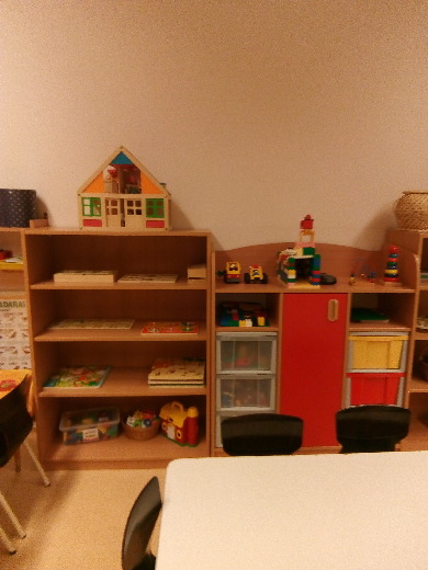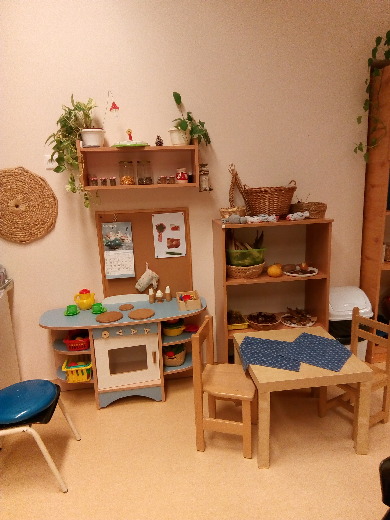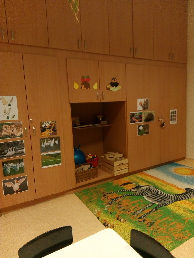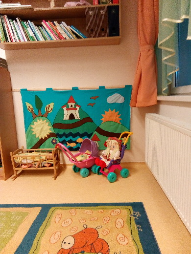 A csoportszobánkban az egyes tevékenységekben való elmélyült játék érdekében alakítottunk ki báb-mese- és zenesarkot, természetpolcot, babakonyhát, helyet az építőszőnyegen a közlekedéshez, a mozgáshoz és kézműves sarkot.