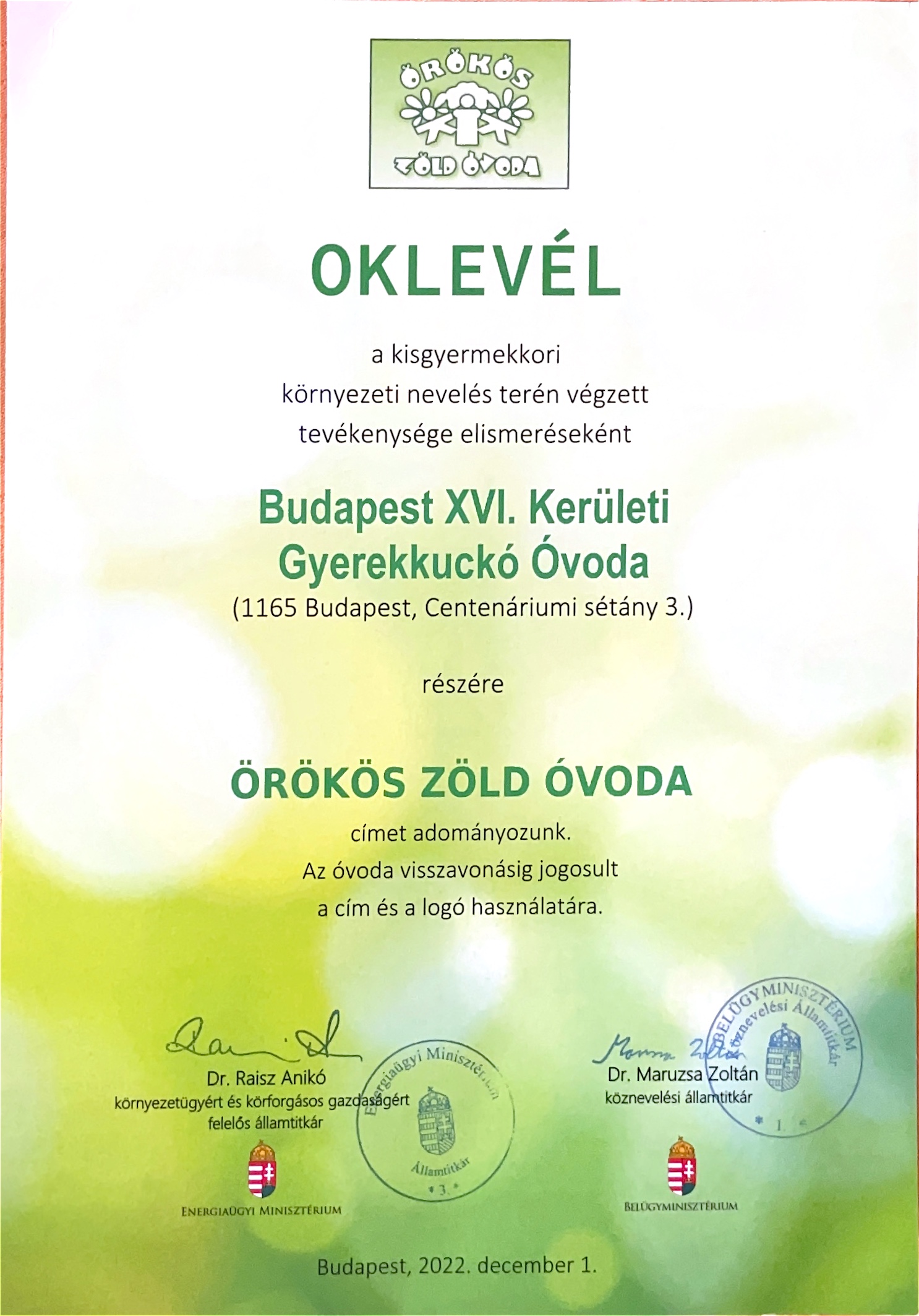 2022-ben Óvodánk elnyerte az Örökös Zöld Óvoda címet, 2020-ban harmadik alkalommal nyerte el a Zöld Óvoda minősített címet.